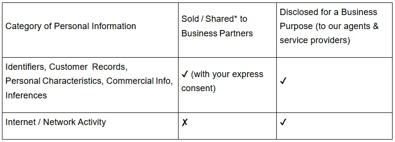 *“Sell” and “Share” have the meanings given in the California Consumer Privacy Act (CCPA/CPRA). We sell/share data only with your express consent (see Section 9) and require recipients to honor GPC or other opt‑out signals and to use the data solely as contracted.