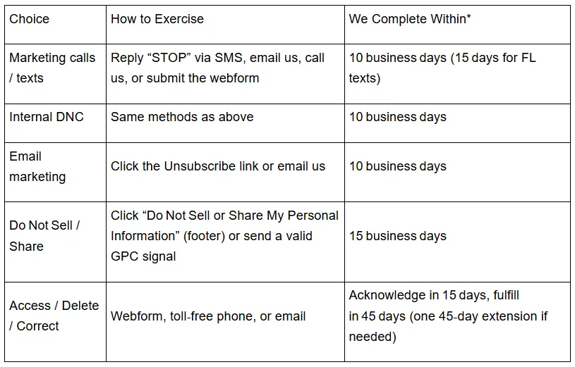 *We notify downstream service providers of sale/share opt‑outs within the same 15‑day window.
